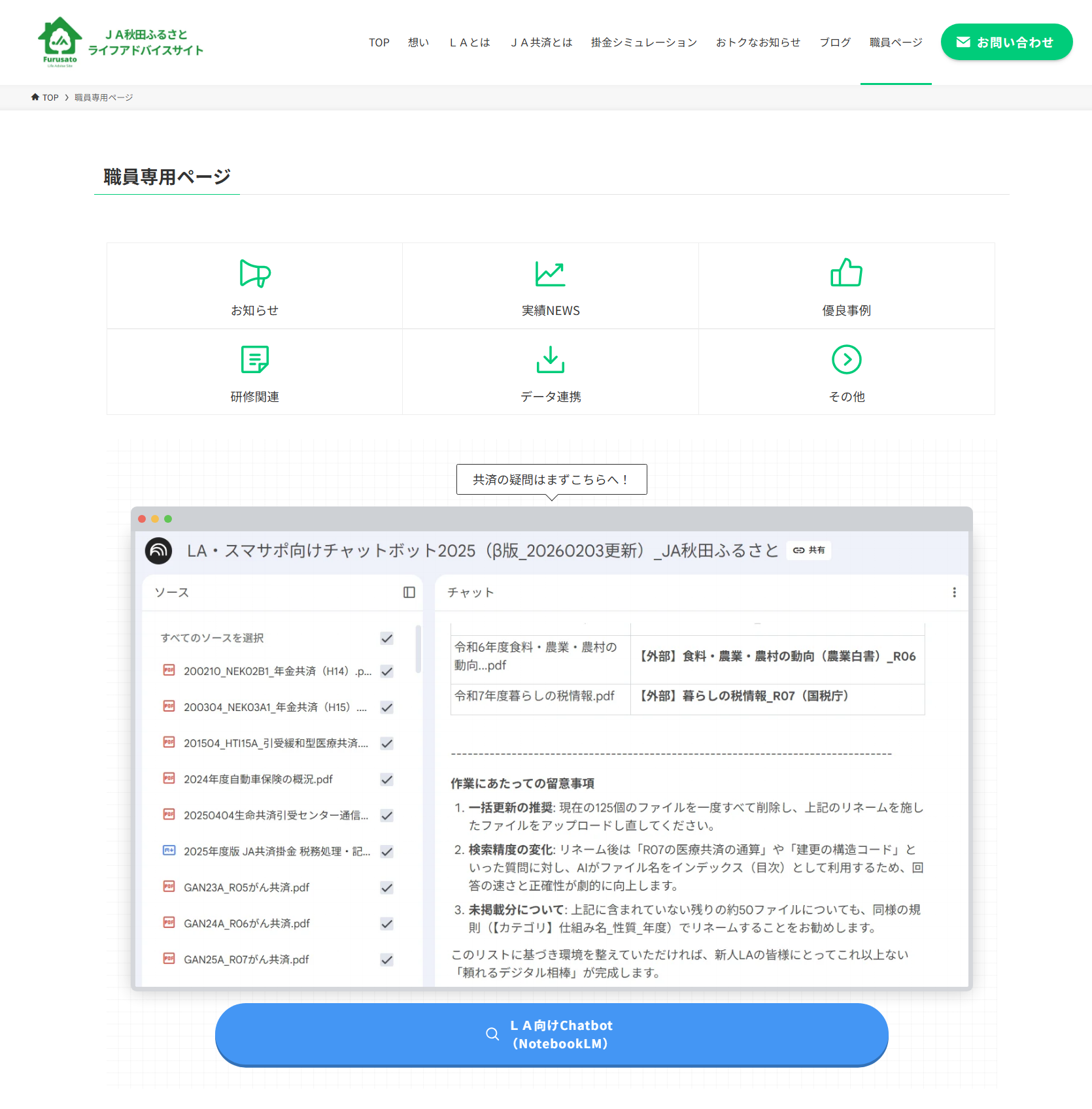 JA秋田ふるさとライフアドバイスサイトから、職員専用ページを開き、Chatbotを開きます。
