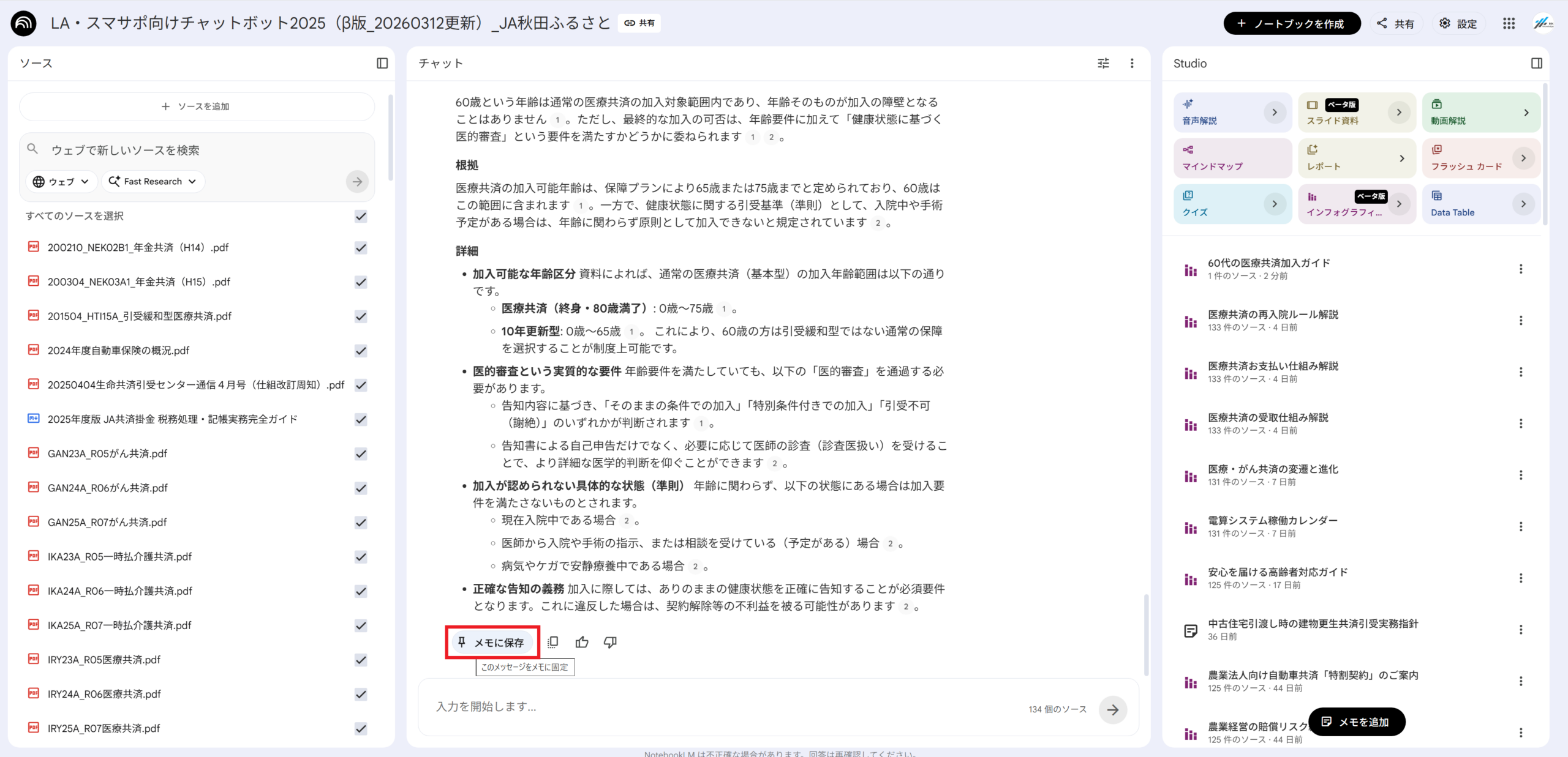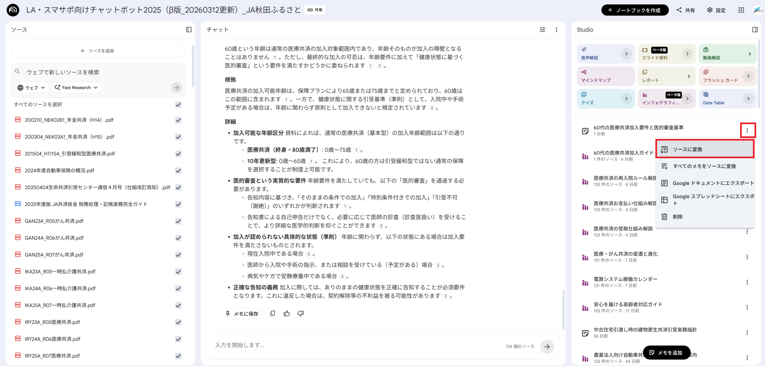 Studio機能は、そのままボタンを押すと、登録されているすべての資料(ソース)を混ぜて要約してしまいます。特定の回答や文章だけを図解したい場合は、以下の「特定の回答だけを変換する手順」に沿って操作を行ってください。