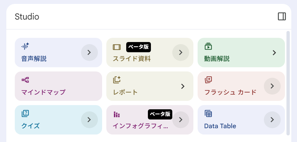 NotebookLMの「Studio」は、読み込ませた資料(ソース)の内容を、AIが自動で分かりやすい別の形式(図解、音声、問題集など)に一瞬で変換・要約してくれる機能です。