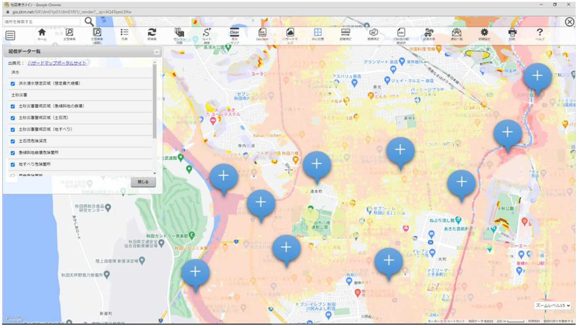 また、ハザードマップを重ねて表示でき、自然災害リスクを喚起することもできます。