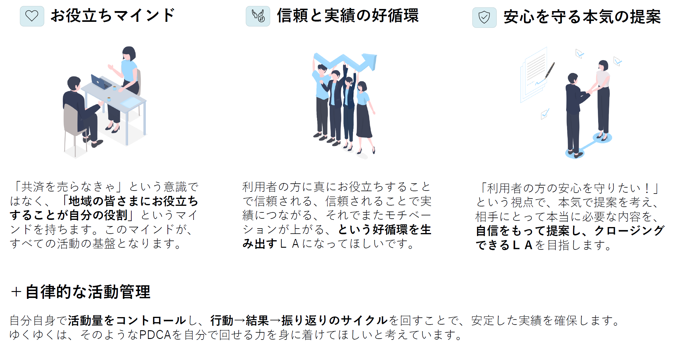 「実績を取ること」を考えるのではなく、「どれだけお役に立てるか・信頼されるか」を第一に考えるLAになってほしいと考えています。