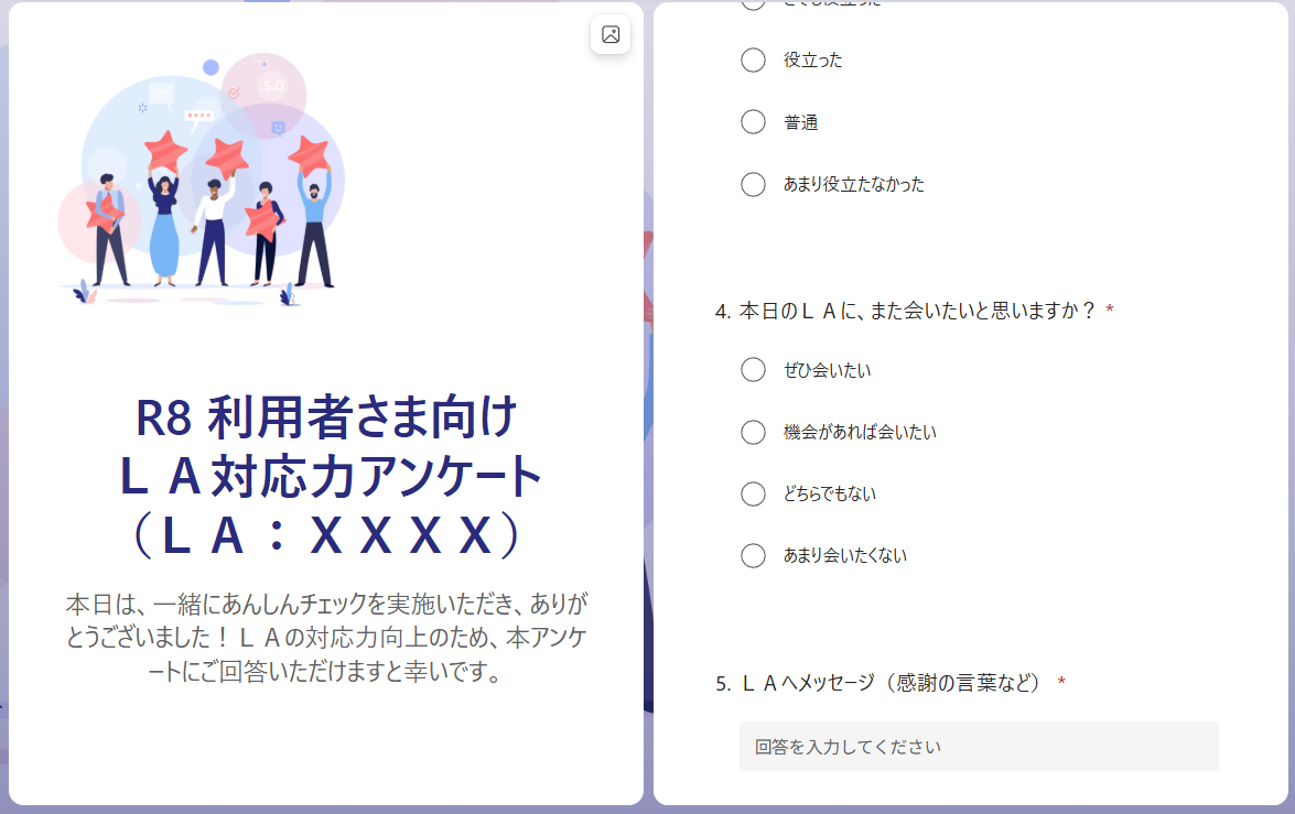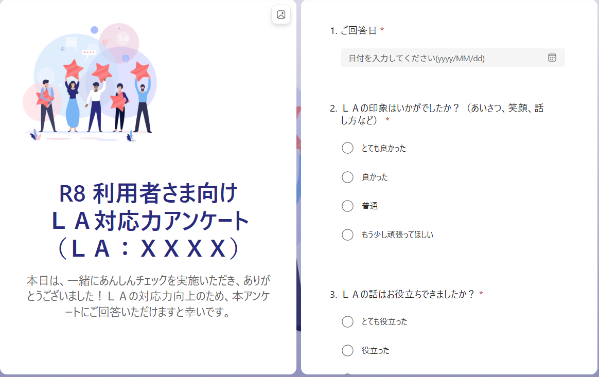 新任LAの皆さんの頑張りを可視化すべく、「利用者さま向けLA対応力アンケート」を実施します。