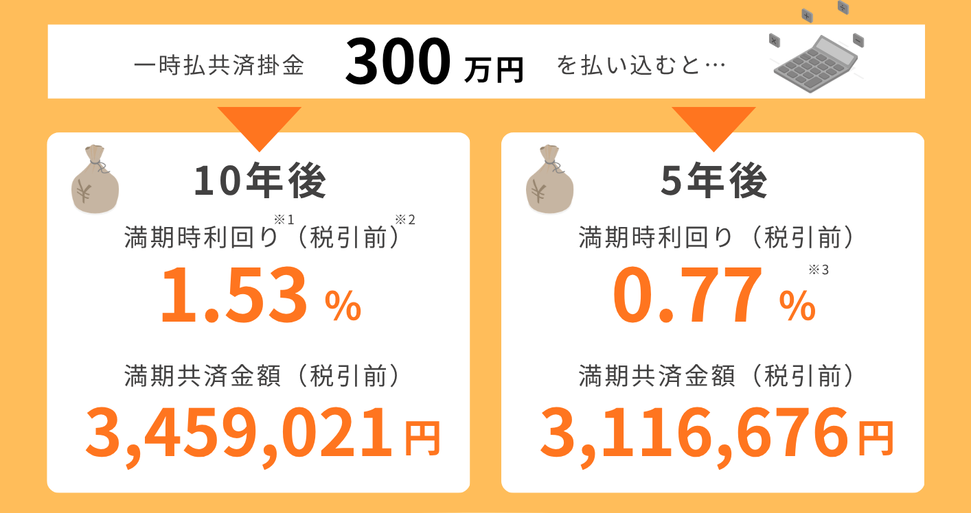 ※1:満期時利回りとは、一時払共済掛金に対する満期共済金の増加額を1年あたりに換算した場合の一時払共済掛金に対する利回り(単利)のことで、ご契約時に全期間の予定利率が確定します。